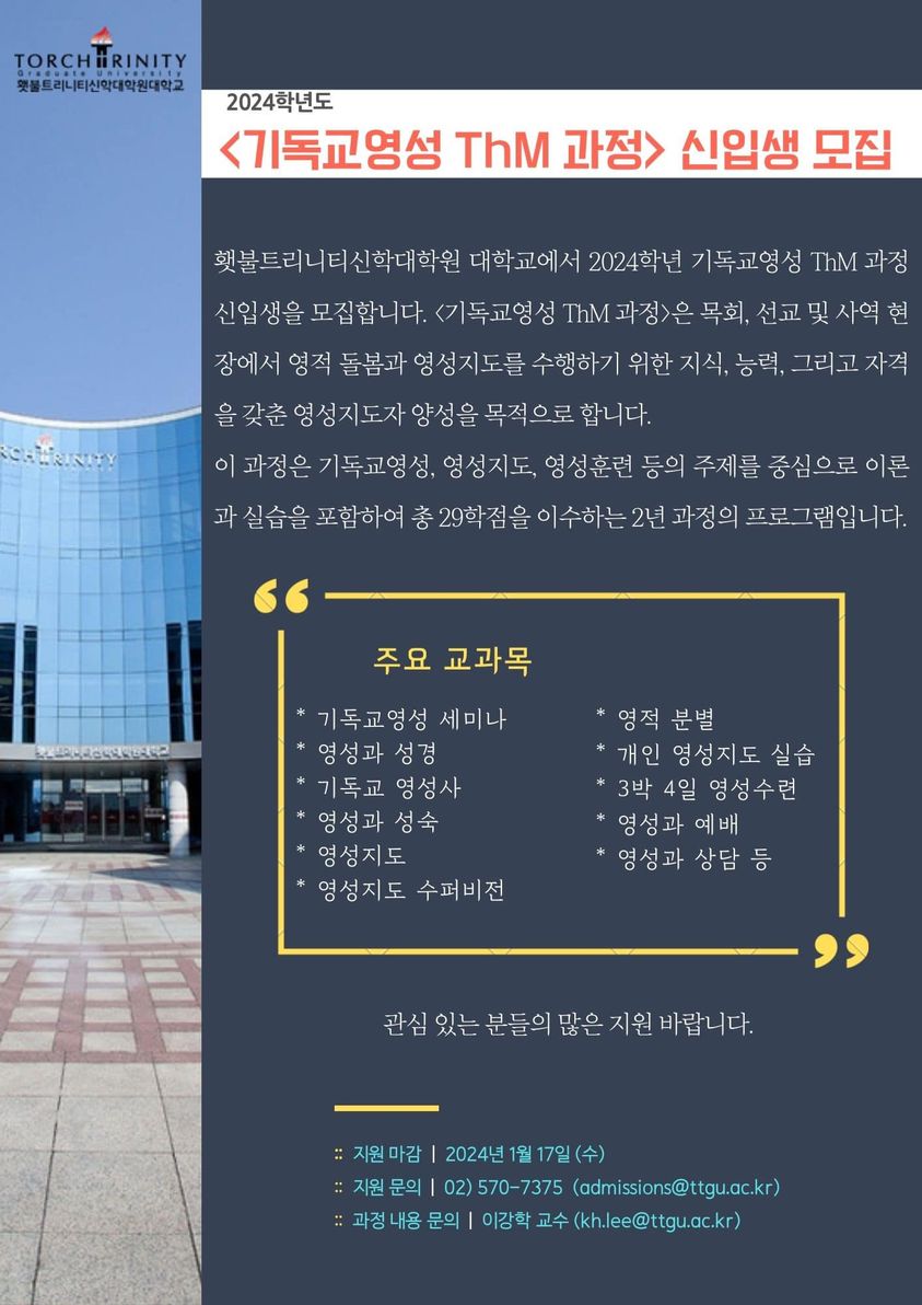 ‘횃불 트리니티’에 입학 하는 과정 자체가 의도하지 않았던 놀라운 과정이었다. 입학 한 그 학기부터 수업에서 ‘유레카’를 외쳤다. 그 동안 머릿속으로 정리하고 의아해 했던 것들이 수업시간에 쏟아져 나왔다. 이로 인해 얻게 된
